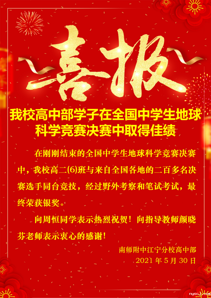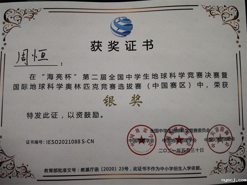 在刚刚举行的全国中学生地球科学竞赛决赛中,我校高二(6)班周恒同学与来自全国各地的二百多名决赛选手同台竞技,经过野外考察和笔试考试,最终荣获银奖。