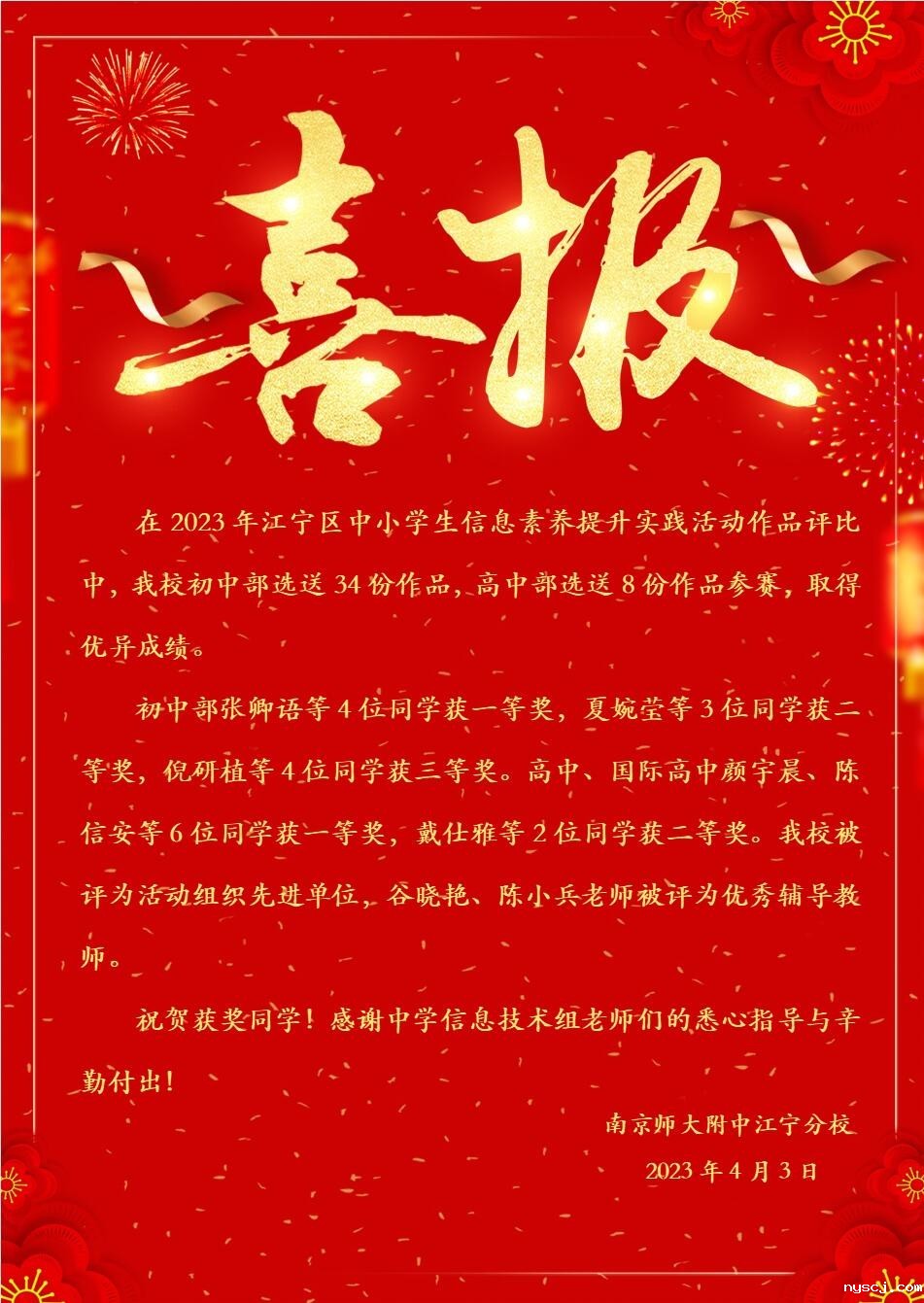 在2023年江宁区中小学生信息素养提升实践活动作品评比中,我校初中部选送34份作品,高中部选送8份作品参赛,取得优异成绩。